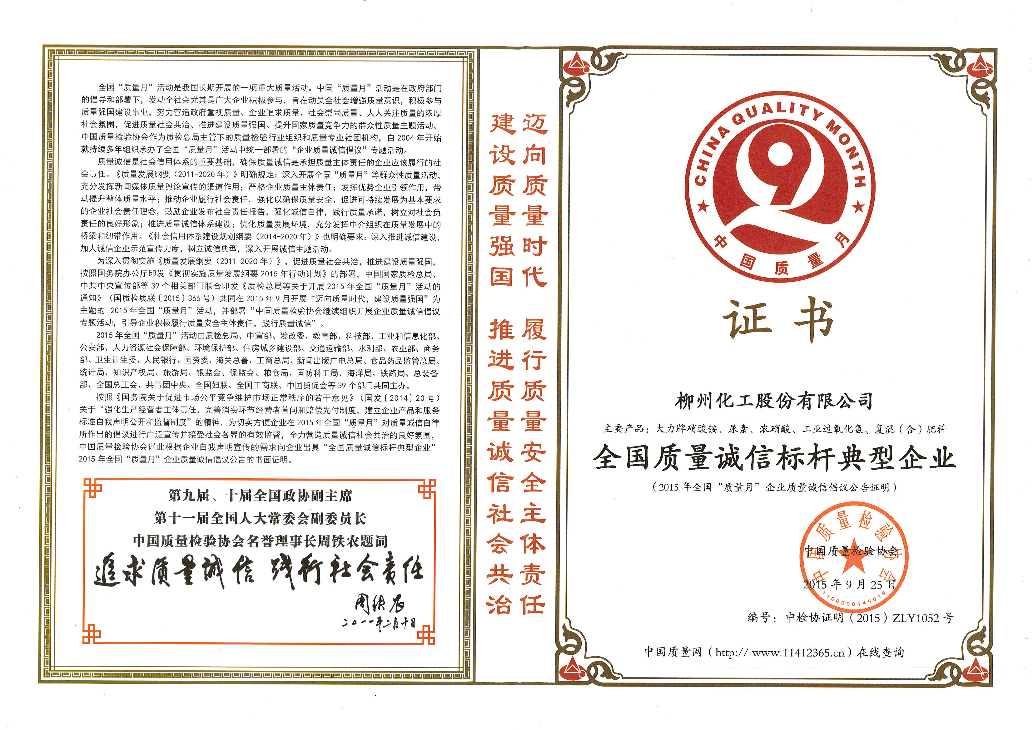 2015年榮獲“全國(guó)質(zhì)量誠(chéng)信標(biāo)桿典型企業(yè)”榮譽(yù)稱號(hào)