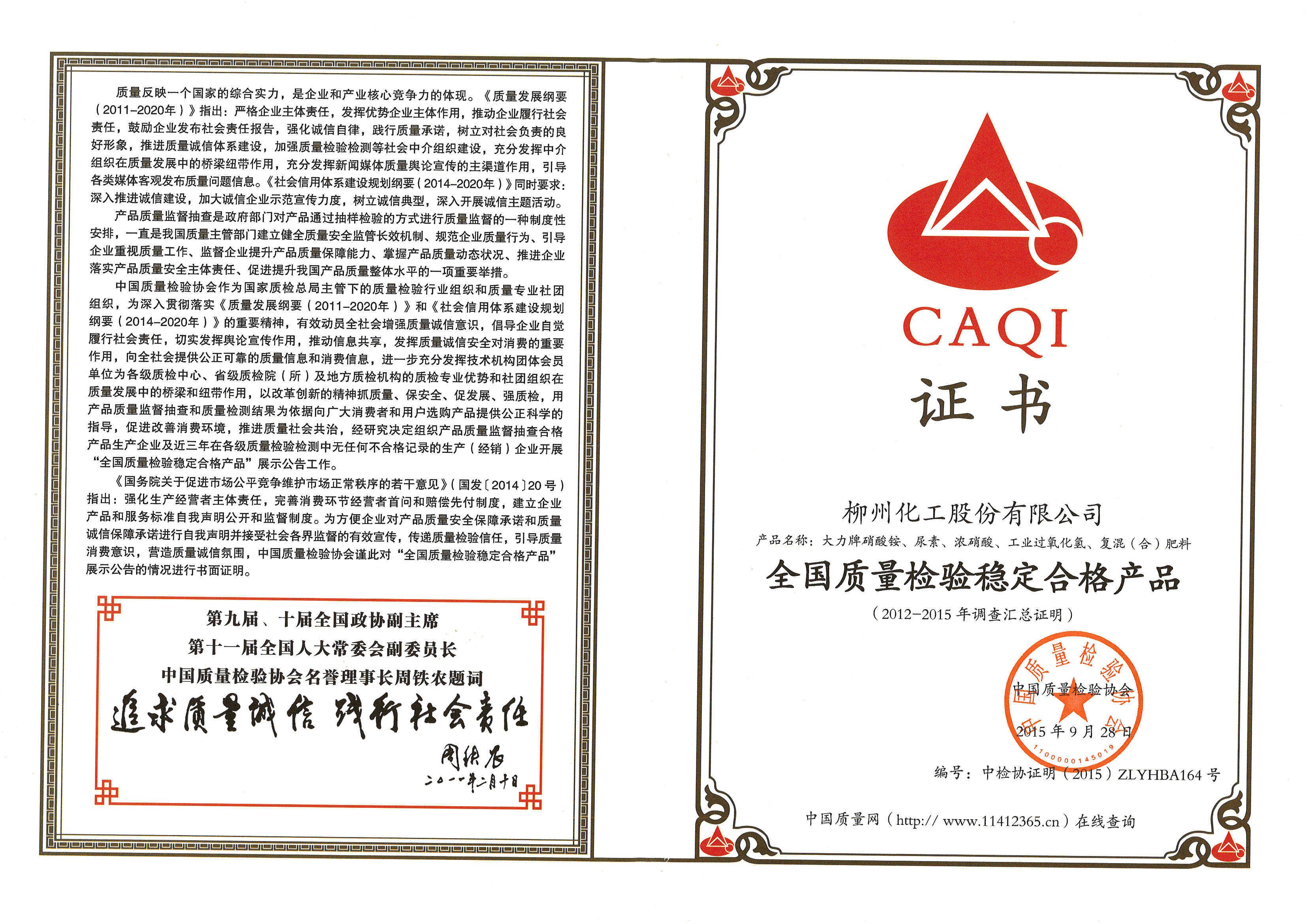 2015年榮獲“全國(guó)質(zhì)量檢驗(yàn)穩(wěn)定合格產(chǎn)品”榮譽(yù)稱號(hào)